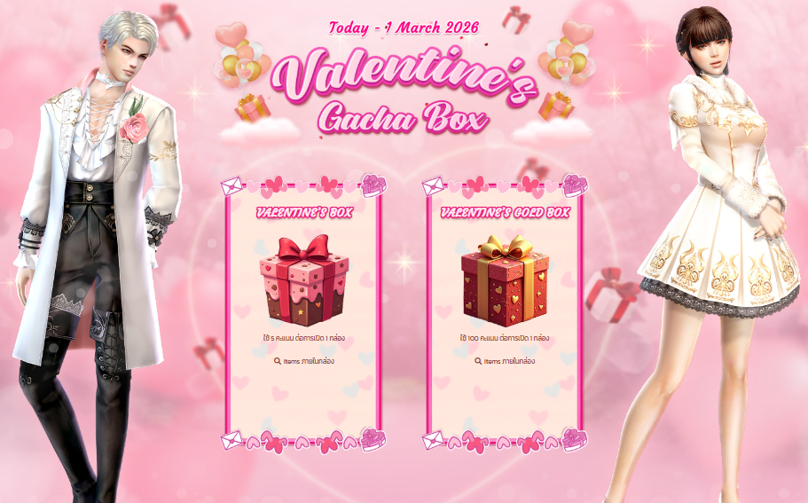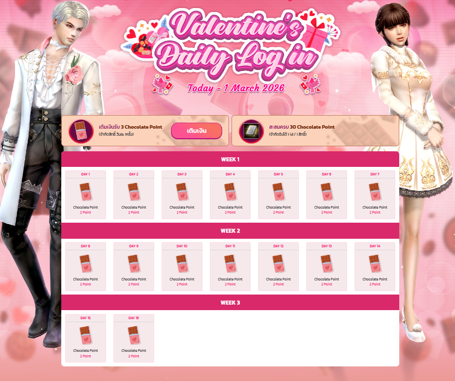 🔸 ในหน้ากิจกรรม "Valentine's Daily Login" ให้ผู้เล่นมาทำการเช็คอินให้ครบตามจำนวนเพื่อให้ได้รับแต้ม Chocolate Point ไว้แลกไอเทมพิเศษ! โดยจะได้รับ 1 แต้ม/วัน