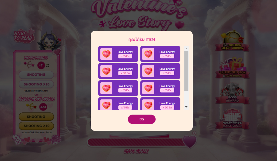 🔸 และเมื่อผู้เล่นร่วมมือกันยิงศรรักใส่คิวปิดจนครบที่กำหนดได้สำเร็จ จะได้รับรางวัลพิเศษเพิ่มเติมโดยคลิกที่เมนู "Boss Reward" ทางด้านขวามือของหน้ากิจกรรมหลัก