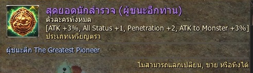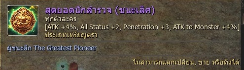 สุดยอดนักสำรวจ (ชนะเลิศ) | ATK +4%, PEN +3 |